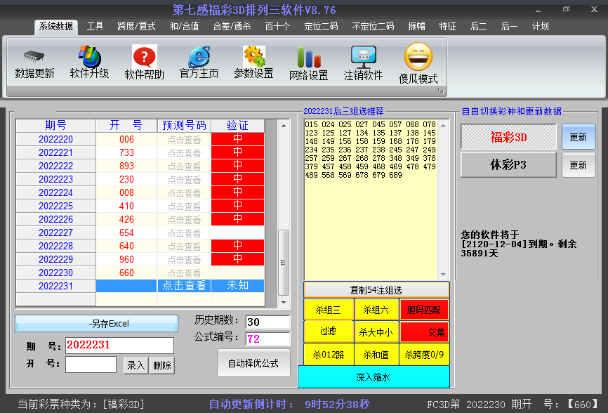 用到了杀组三、胆码匹配、杀历史号30期、大底500期历史号码交集、杀和值、杀跨度、杀012路,全都是用的第七感福彩3d软件的默认参数,希望对玩家们有所帮助。